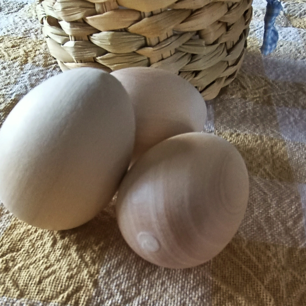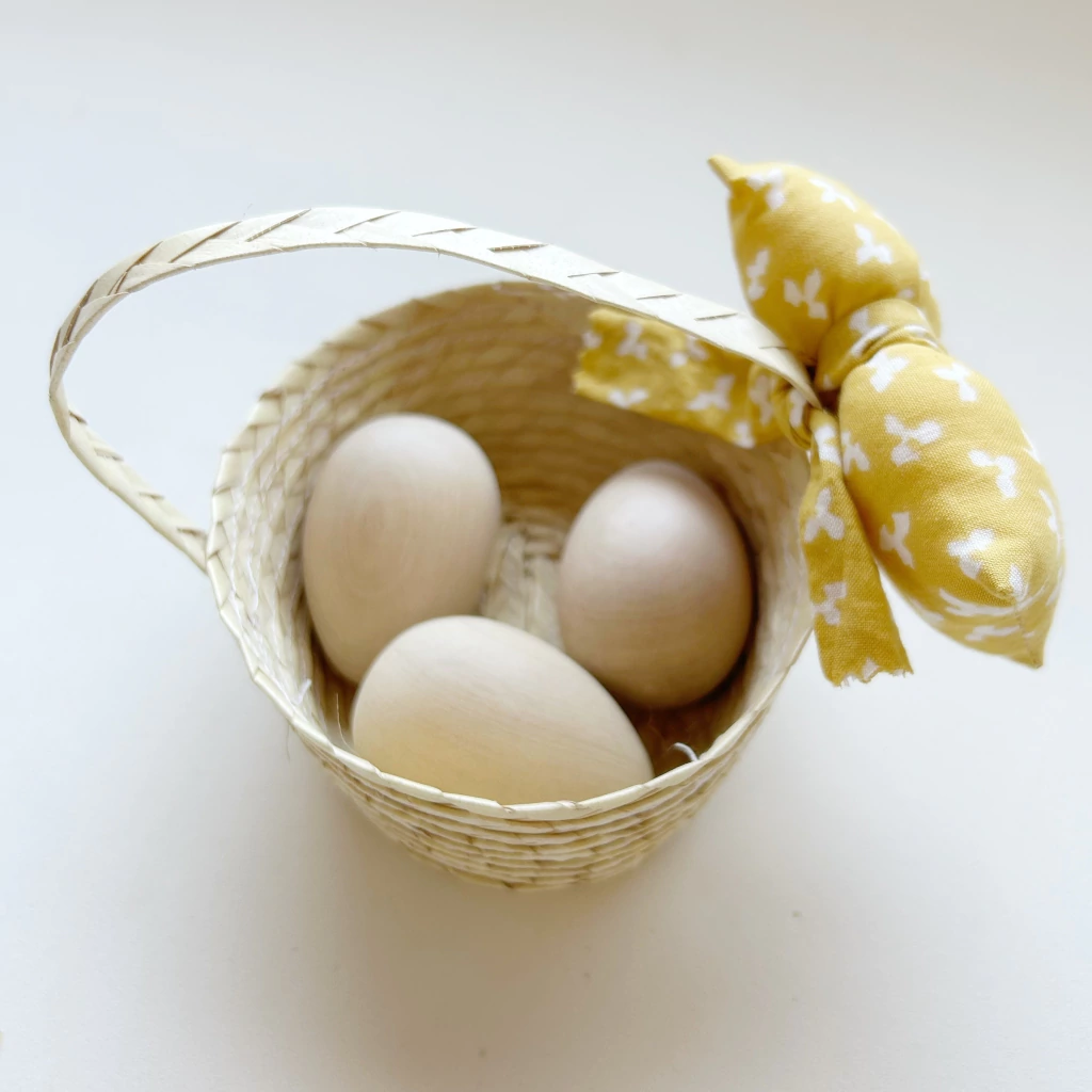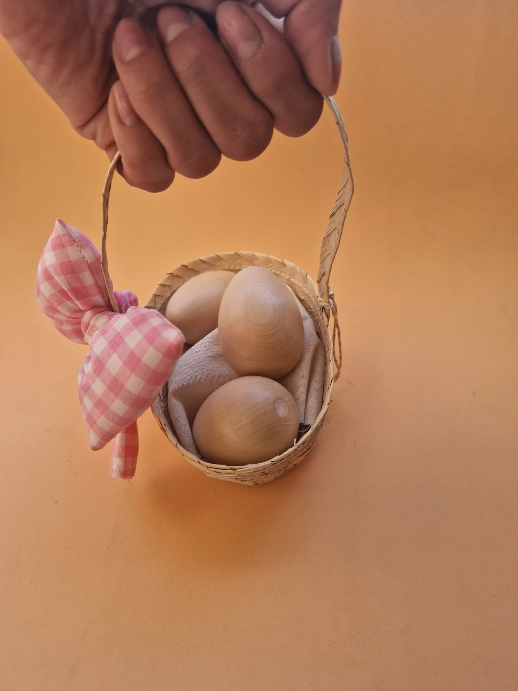 La canasta es artesanal y tiene una almohadilla de tela interior, con 3 huevos de madera maciza con excelente terminación. Suavecitos al tacto, color uniforme.