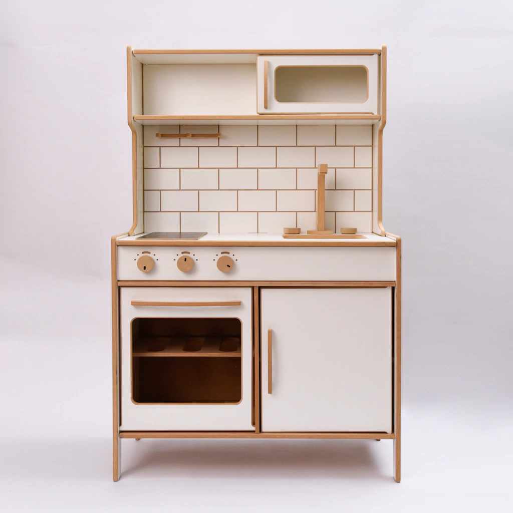 Es súper completa. Trae horno con puerta y estante. Estantes de guardado con puerta (no solo es una cocina, ahí podés guardar juguetes).